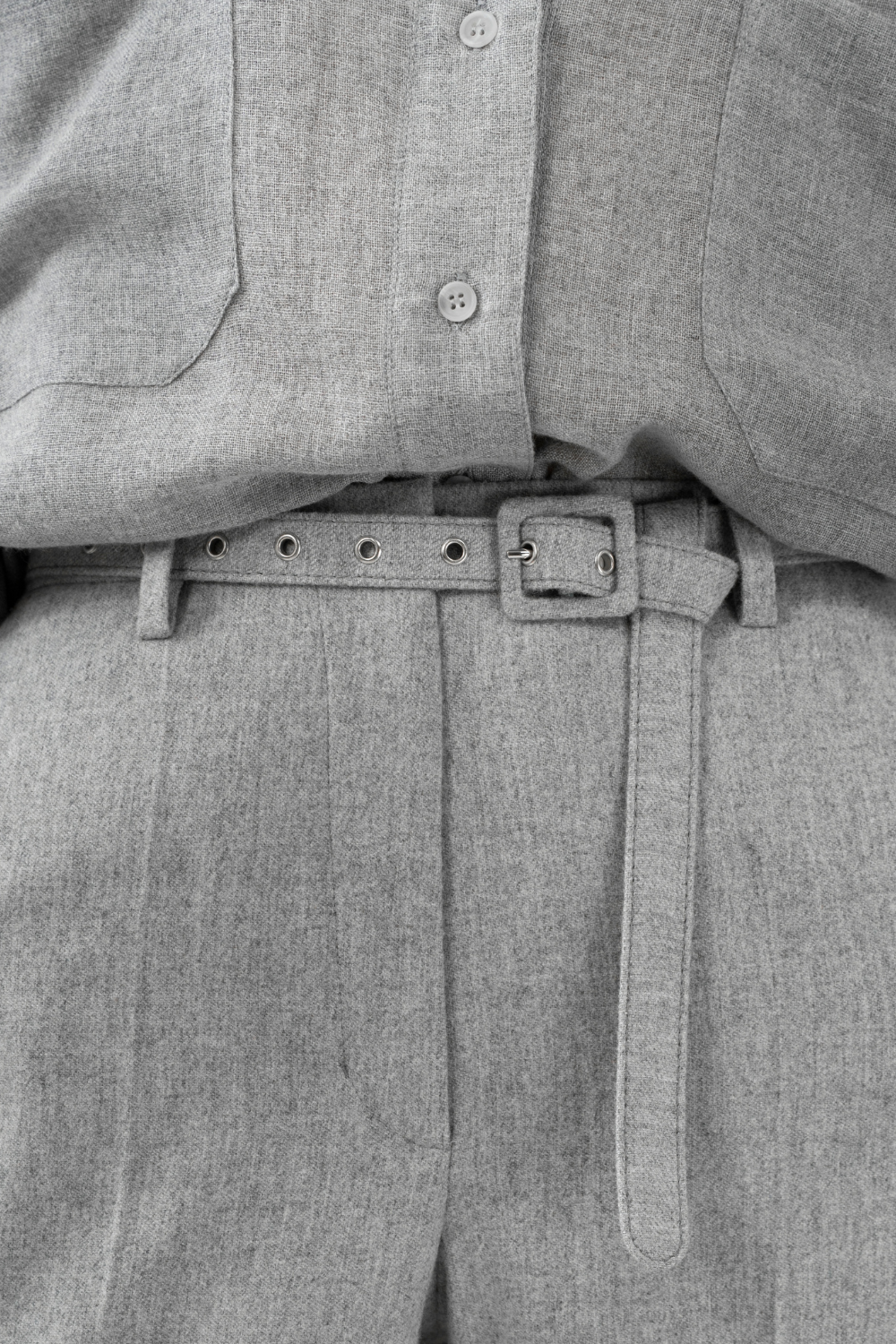 Текстильний ремінь у стриманому сірому відтінку, що додає образу графічної чіткості. Лаконічна фактура м’яко контрастує з кольором одягу, не перетягуючи увагу. Працює як функціональний і стилістичний акцент у різних комбінаціях. Деталь, що об’єднує образ і підкреслює силует.
