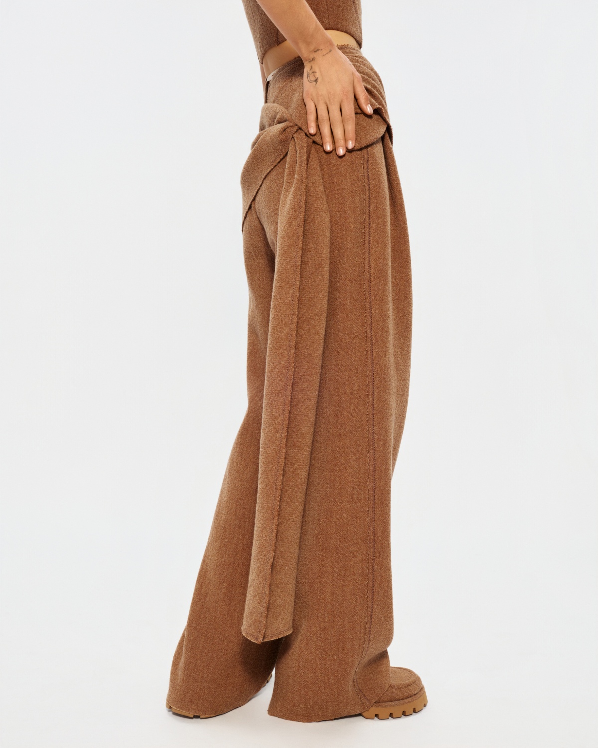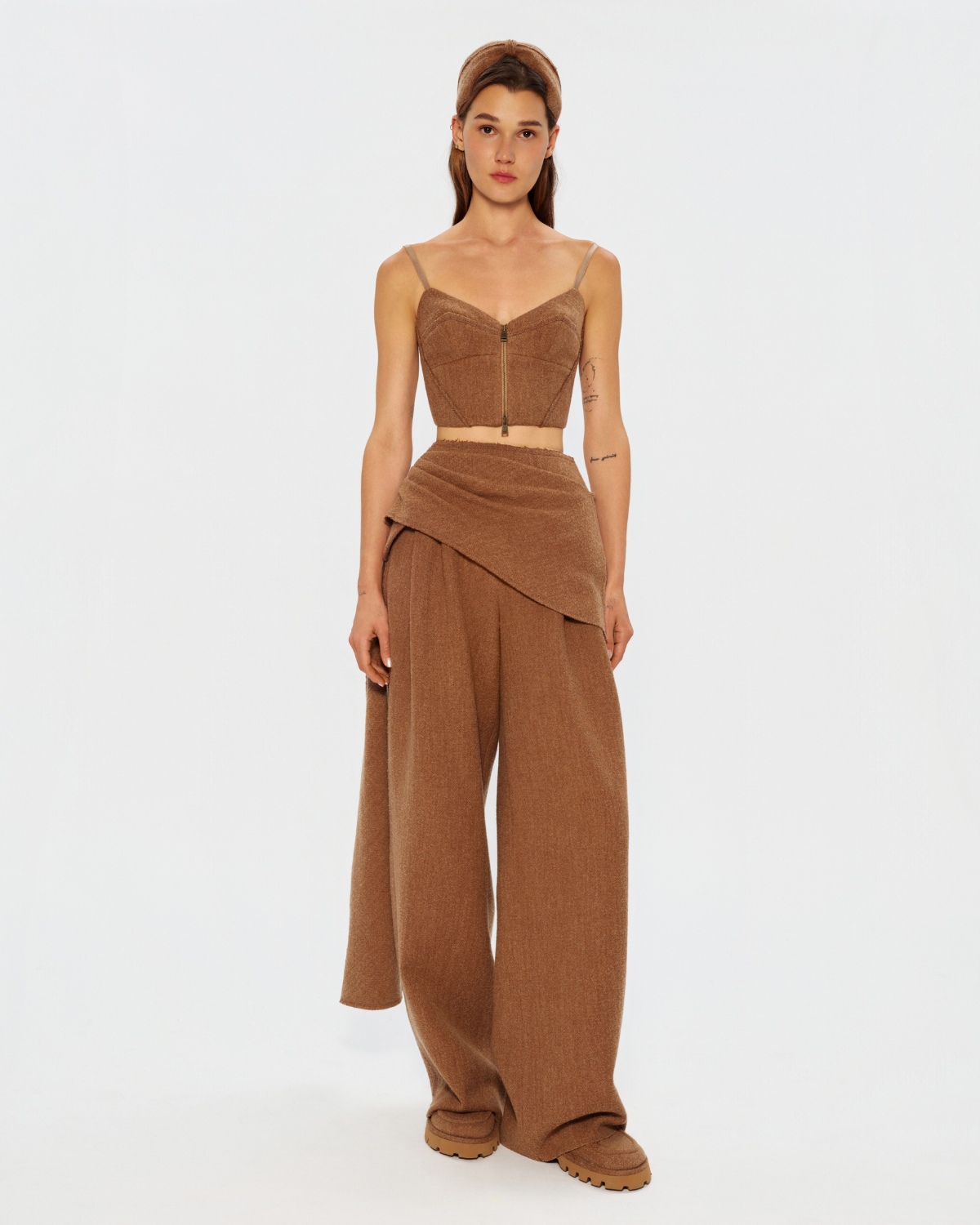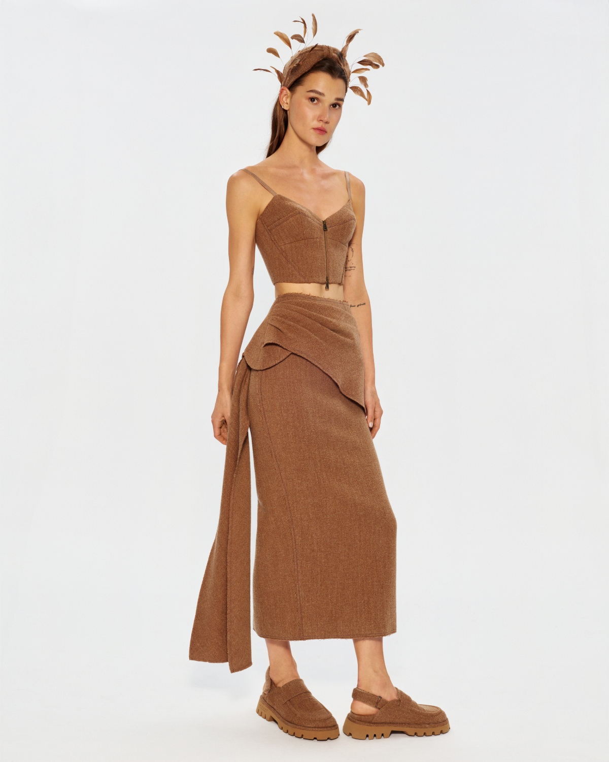 Баска з вовняної костюмної тканини. Асиметричний край створює динаміку ліній і підкреслює рух. М’яка фактура матеріалу врівноважує графічність форми, дозволяючи легко комбінувати баску зі штанами, спідницями чи сукнями для побудови багатошарових образів.