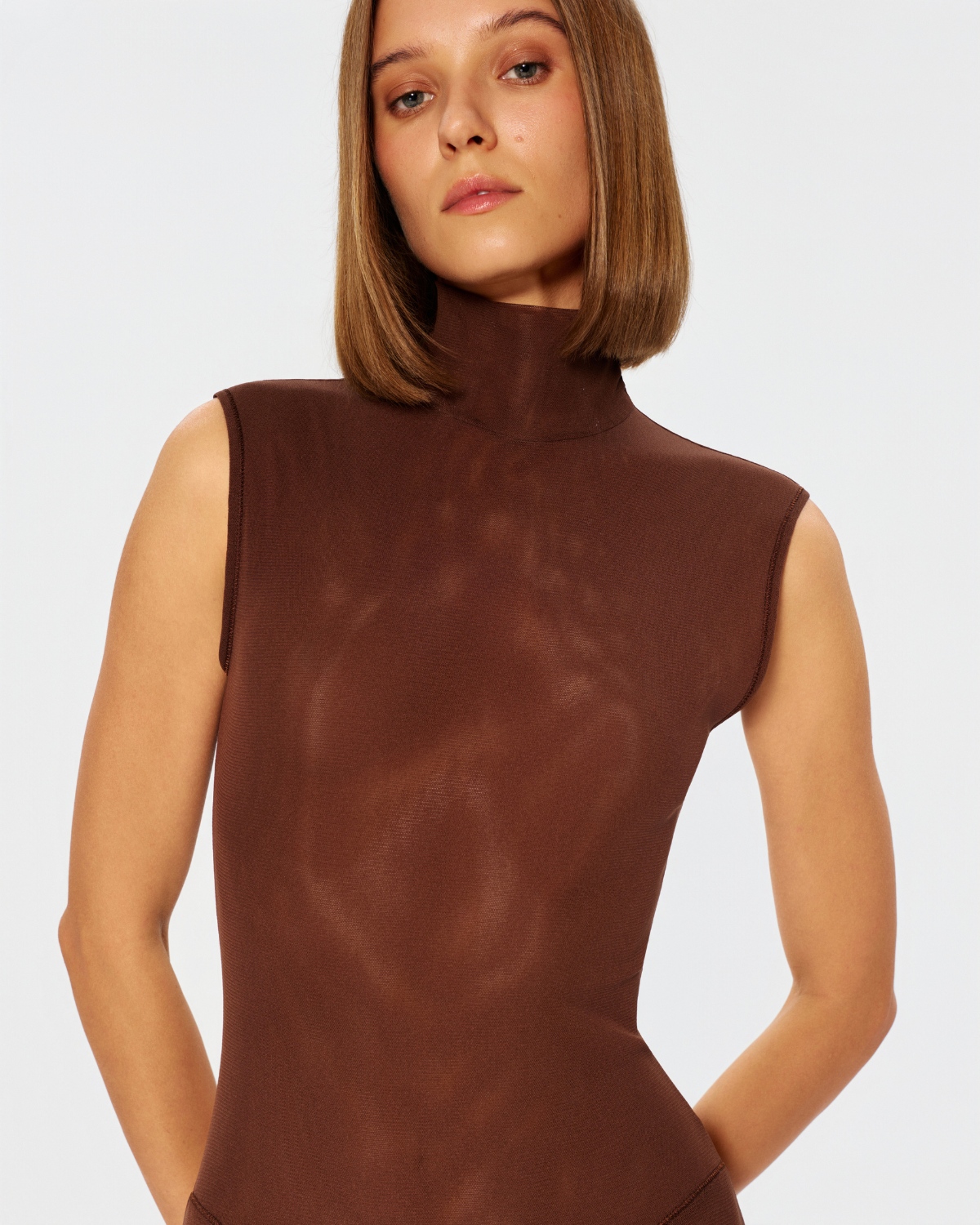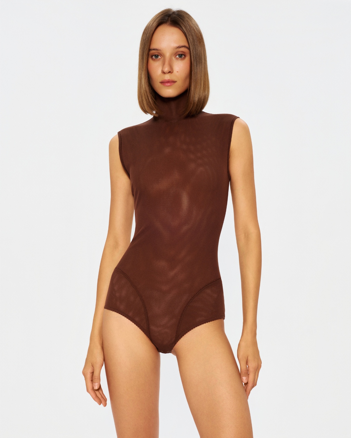 Боді з напівпрозорої сітки у відтінку espresso. Ідеально працює як нижній шар для багатошарових стилізацій із жакетами чи светрами