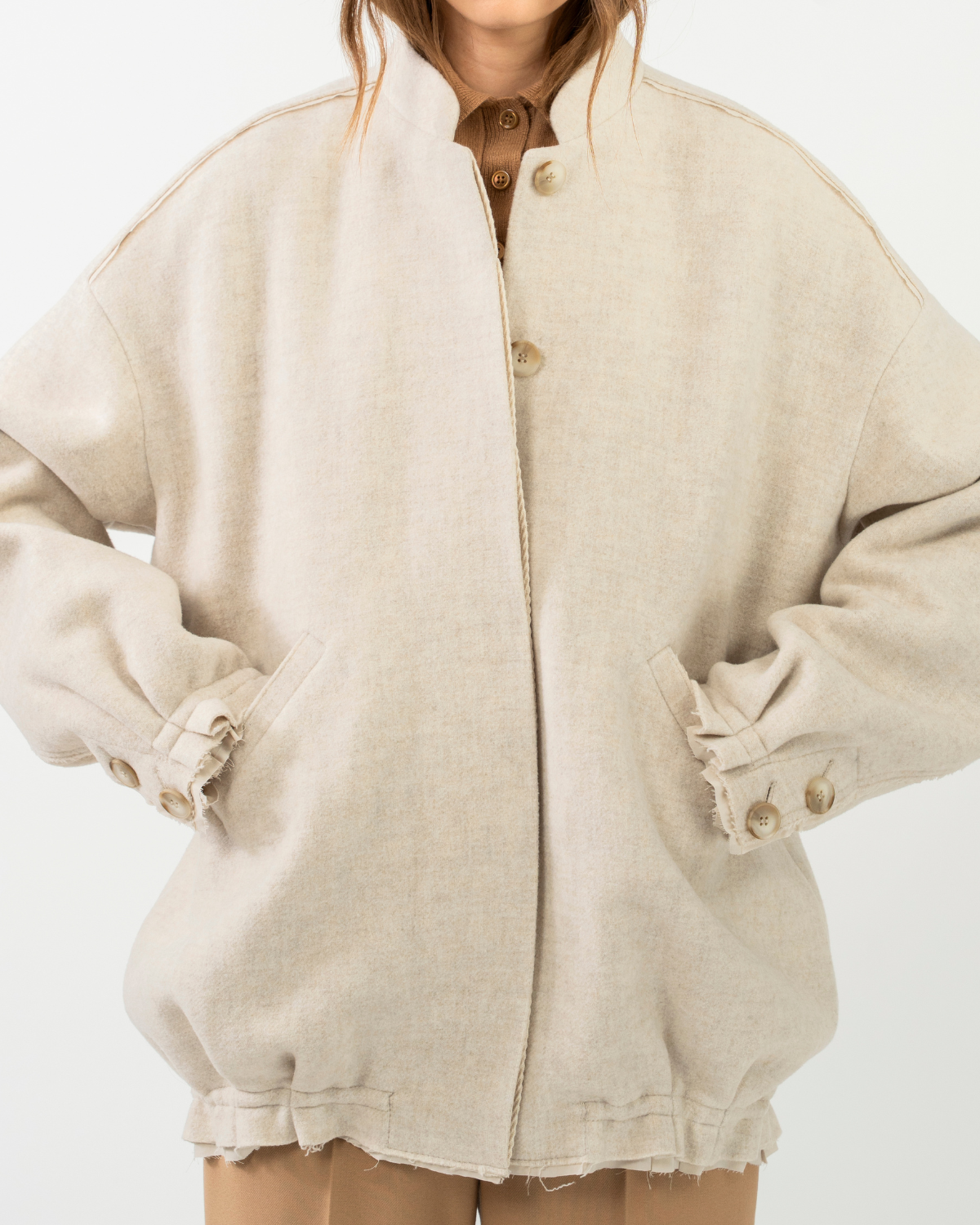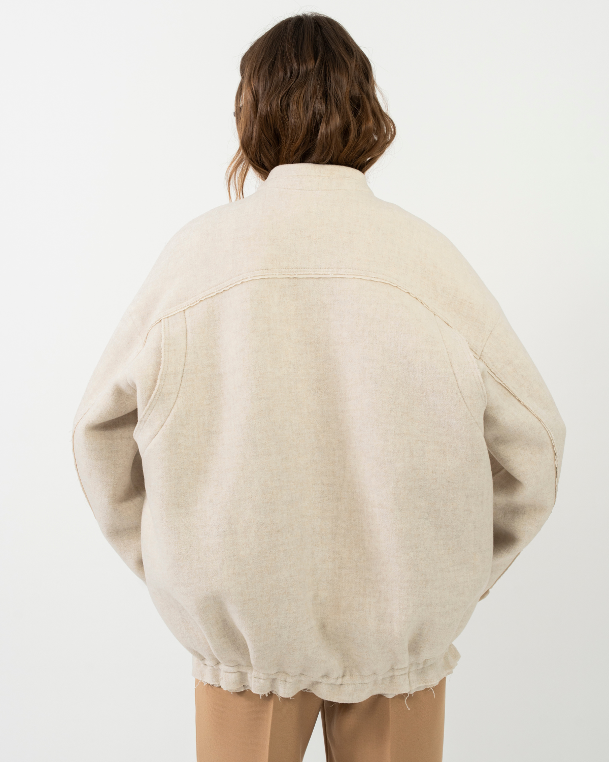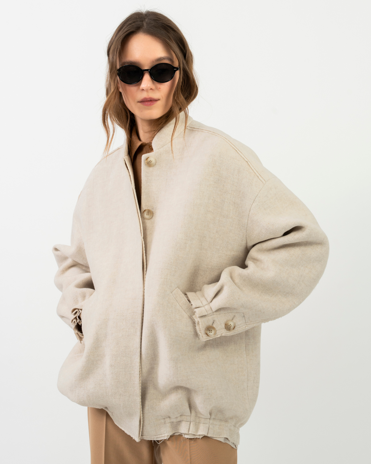 Мінімалістичний бомбер у світлому натуральному відтінку — про баланс між розслабленістю та продуманим дизайном. Об’ємний силует зі спущеною лінією плеча створює сучасний настрій, а чисті лінії роблять модель універсальною для щоденних образів. Бомбер м’яко тримає форму та комфортно адаптується до руху. Акуратна застібка на сховані ґудзики, функціональні кишені та делікатно зібраний низ додають виробу архітектурності. Ідеальний вибір для міжсезоння — поєднується як з класичними брюками, так і з денімом чи трикотажними сукнями.