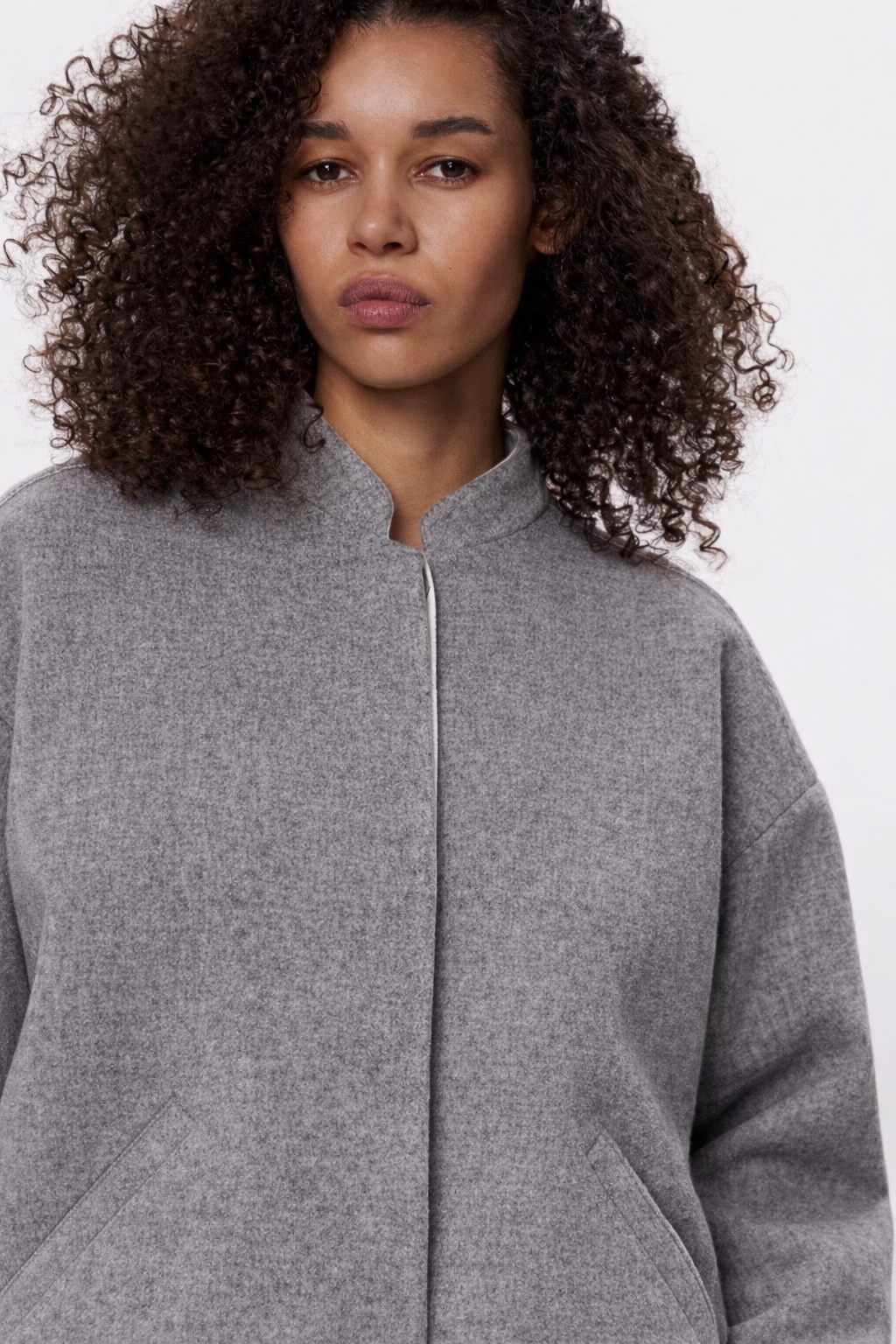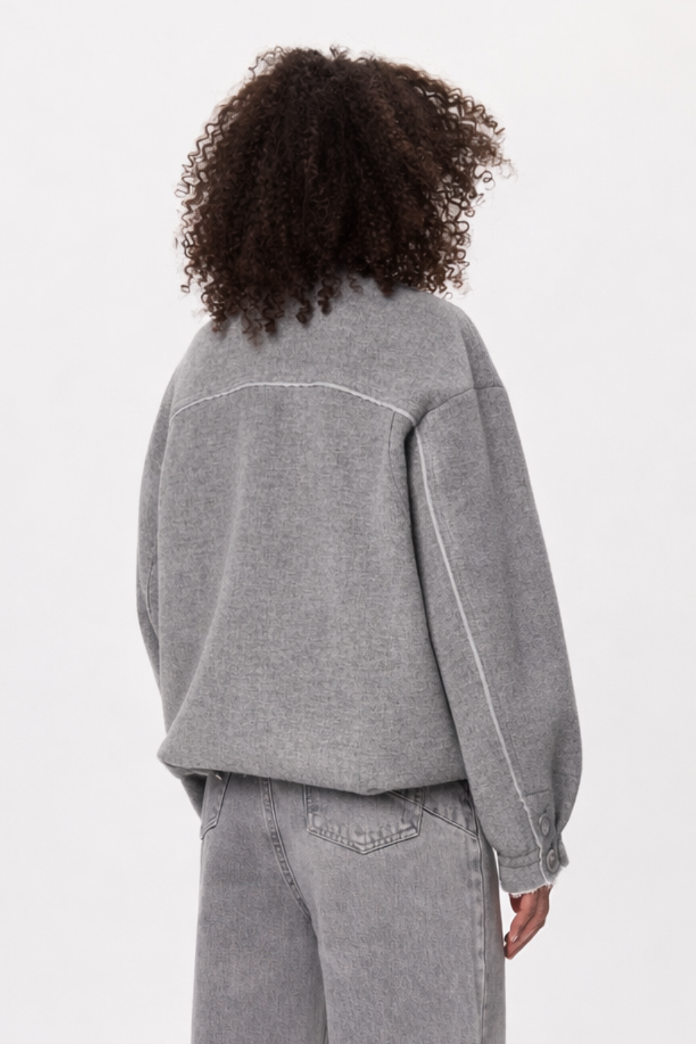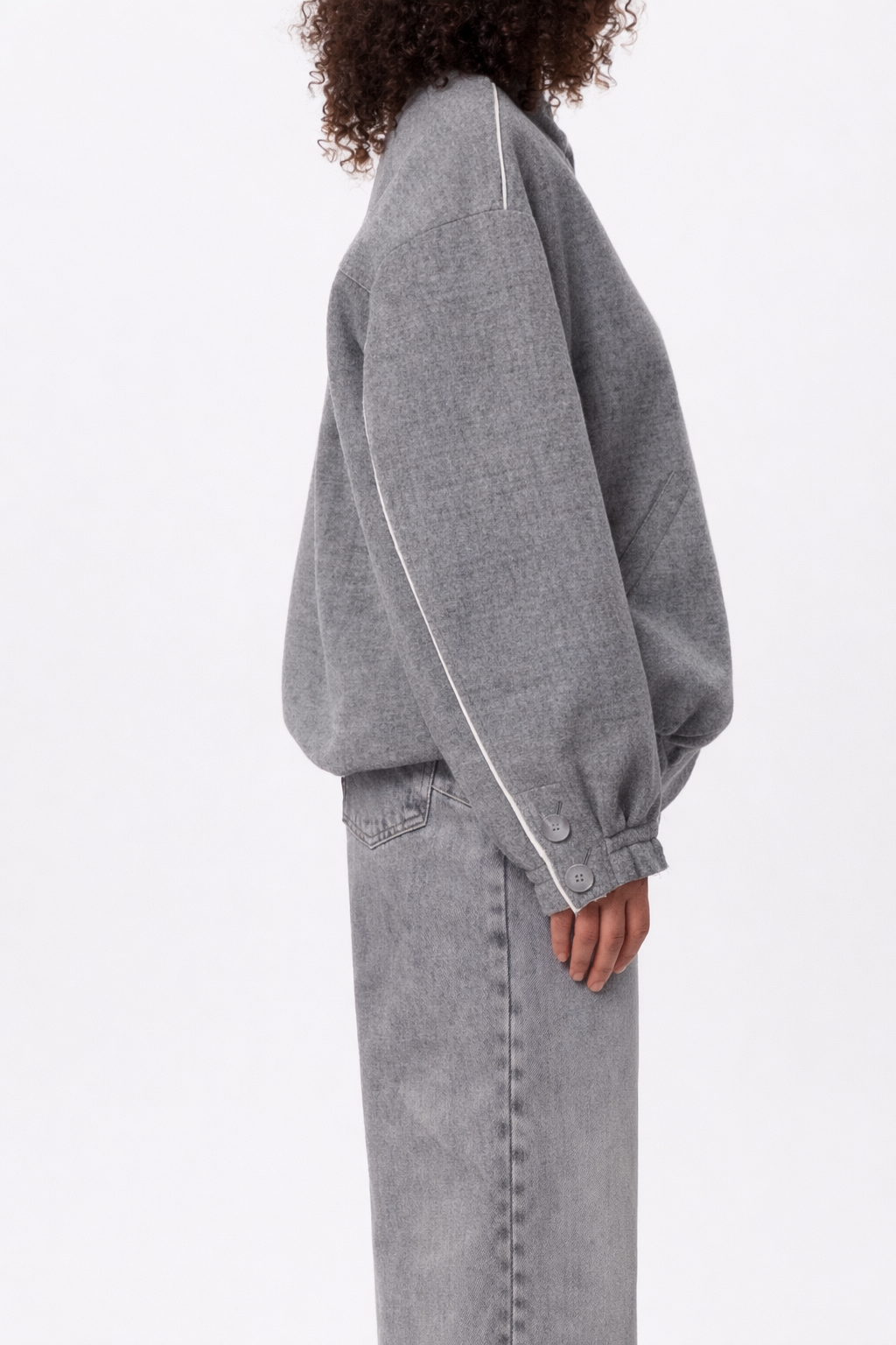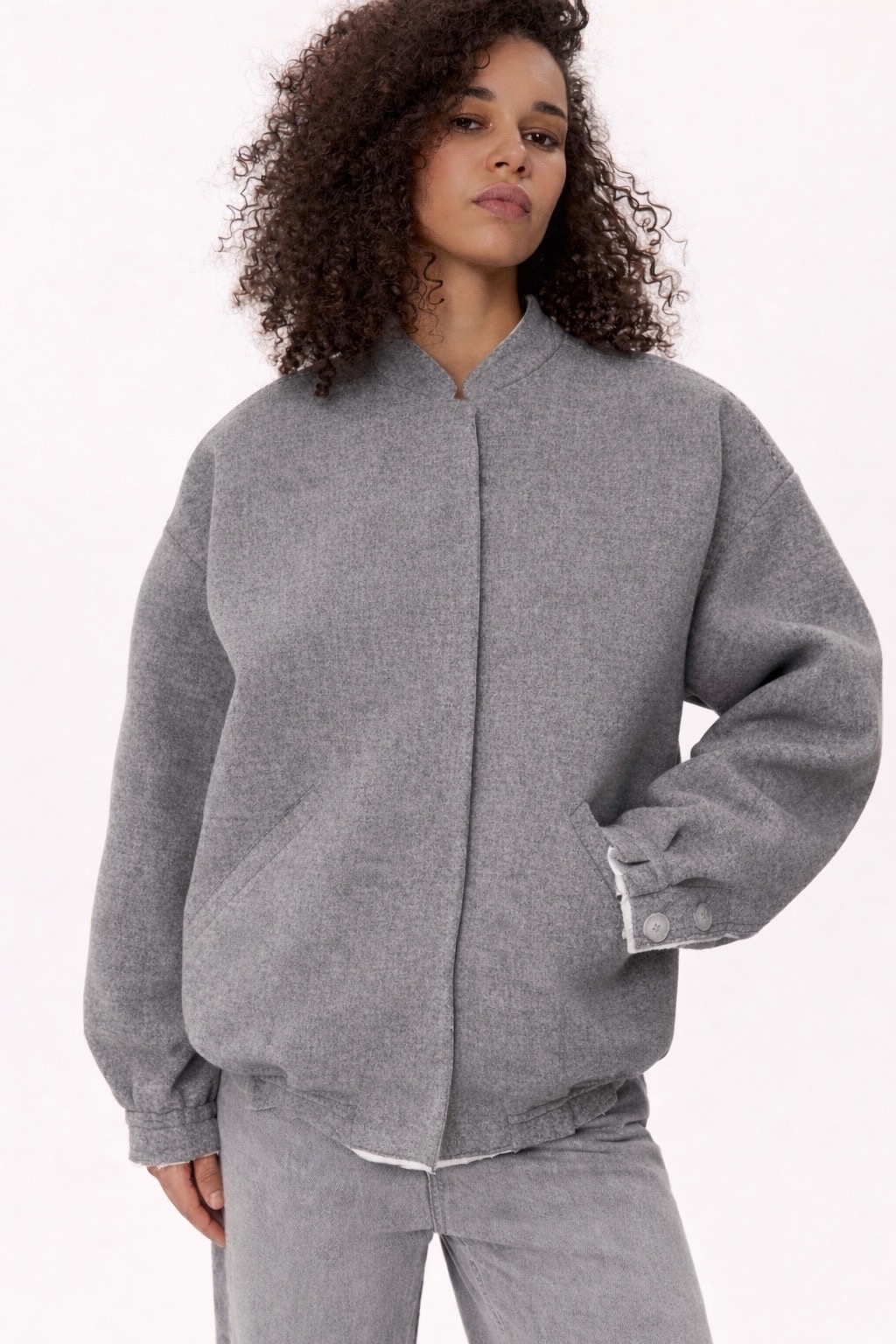 Бомбер виконаний у темно-сірому відтінку з делікатною фактурою тканини, яка додає глибини навіть мінімалістичній формі. Об’ємний крій із заниженою лінією плеча створює розслаблений, сучасний силует, що легко інтегрується в щоденний гардероб. Комір-стійка без зайвих деталей підкреслює чистоту ліній, а прихована застібка зберігає цілісність образу. Рукави з акцентними манжетами та ґудзиками додають характеру, тоді як легка необробленість країв надає речі відчуття тактильності й живої недосконалості.