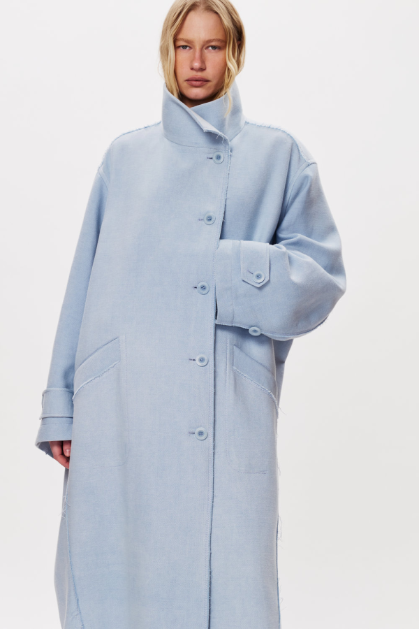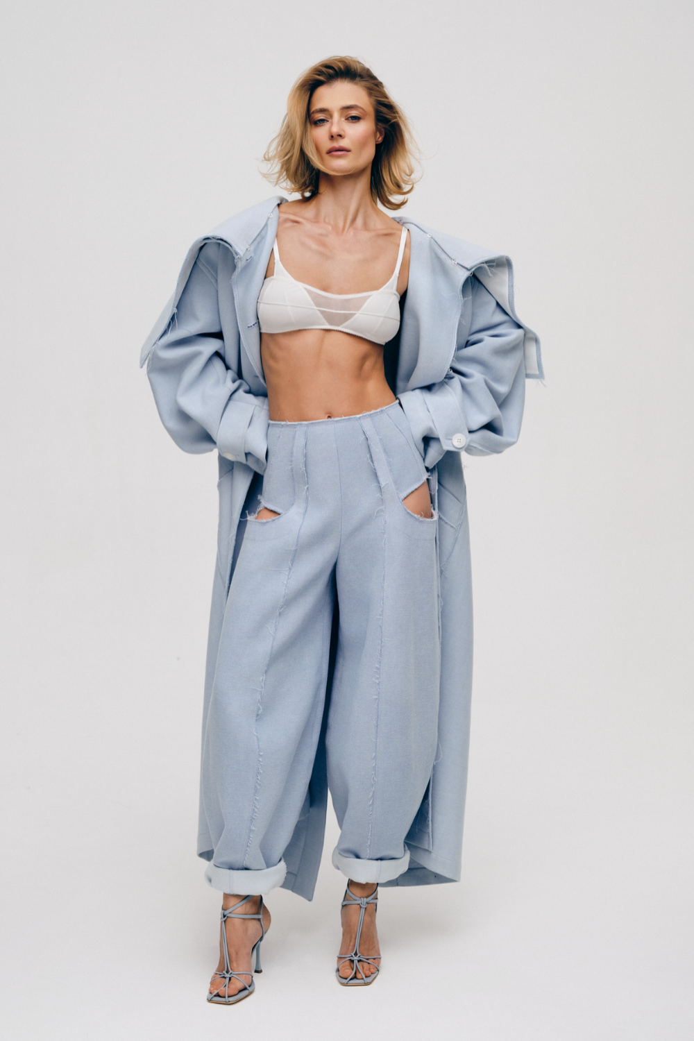 Модель із високою посадкою формує чітку лінію талії та подовжує силует. Об’ємні, м’яко заокруглені штанини створюють виразну форму «балон», що звужується донизу та фіксується широкими підкоченими манжетами. Конструктивні рельєфи та шви виконані назовні з необробленими зрізами. Акцентна деталь — вирізи в зоні стегон, які відкривають тіло й додають образу сміливої сучасності. Мінімалістичний верх поєднується з експериментальною лінією низу, балансуючи між структурністю та легкістю. Джинси ідеальні для стилізацій із лаконічним топом і витонченими босоніжками — як у денному міському образі, так і в більш концептуальних поєднаннях.