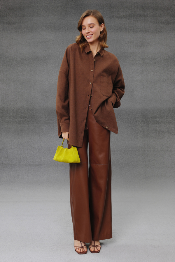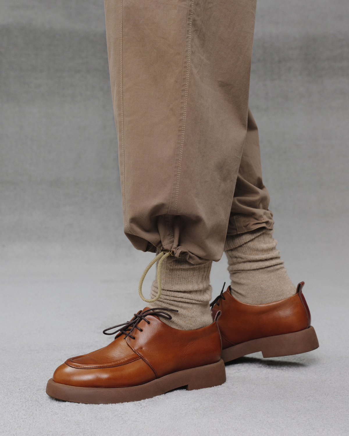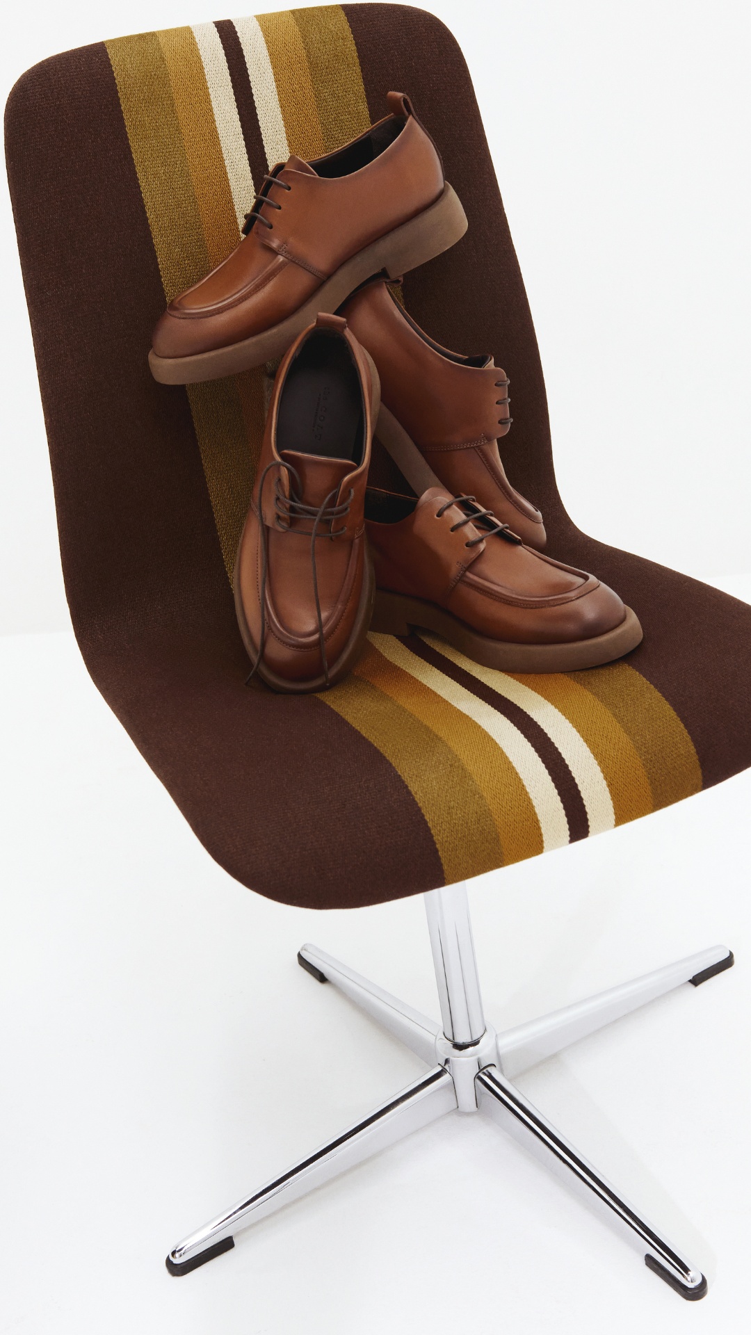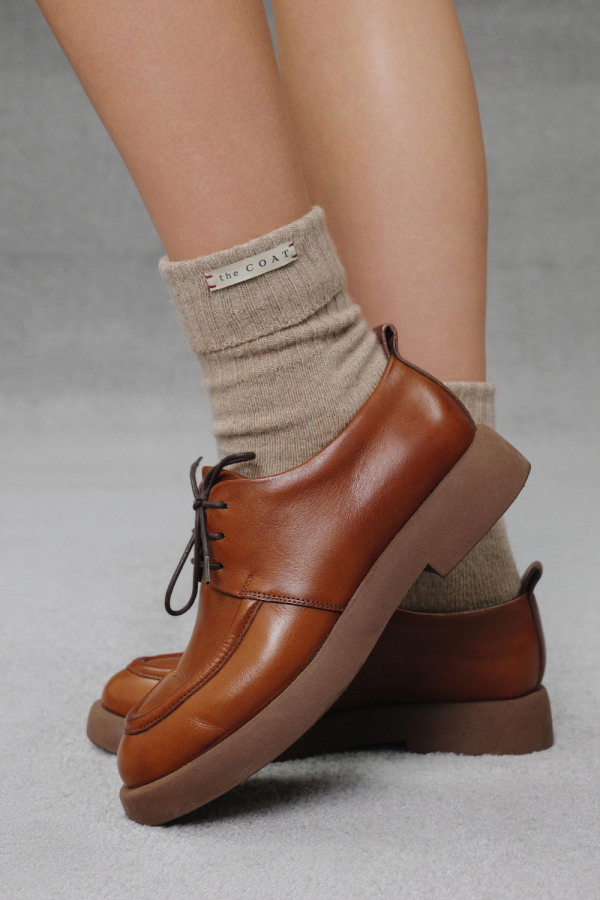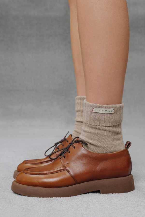 Дербі з гладкої шкіри глибокого коричневого відтінку — сучасна інтерпретація класичної пари. Масивна, але легка підошва з м’яко окресленим профілем додає взуттю графічності й впевненості, водночас забезпечуючи комфорт у русі. Лаконічна шнурівка підкреслює чистоту ліній, а заокруглений носок балансує між строгістю та м’якістю форми. Ці дербі поєднують архітектурну точність і комфорт — органічно виглядають у поєднанні зі спідницею, шортами чи класичними брюками, створюючи відчуття сили й бездоганного смаку.