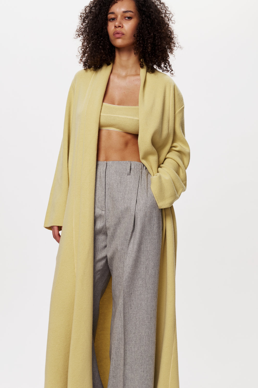 Довгий трикотажний кардиган з м’якою, пластичною фактурою. Вільний силует без застібки формує чисту вертикаль і дозволяє легко нашаровувати образ. Комфортна модель для міжсезоння та повсякденного гардероба.