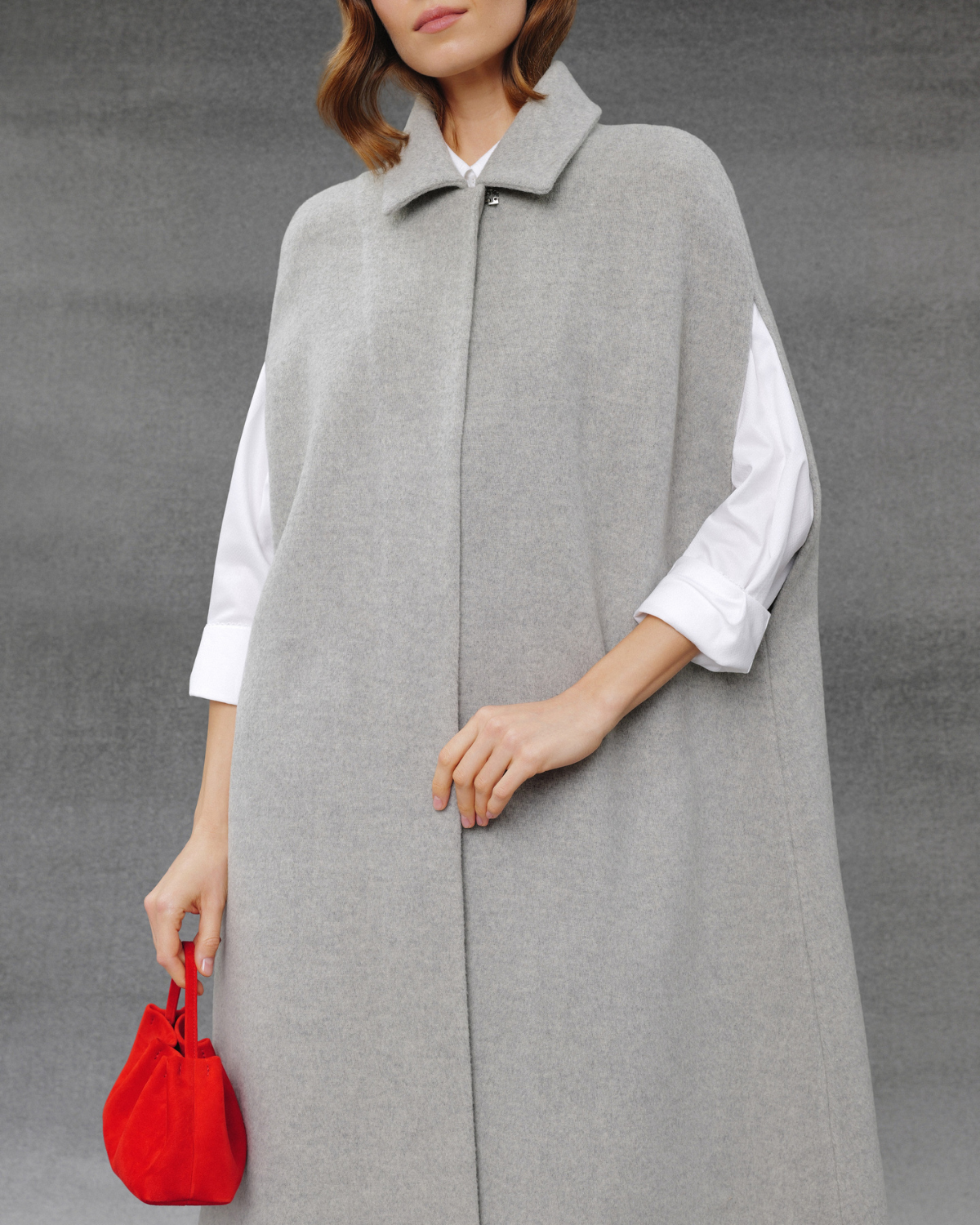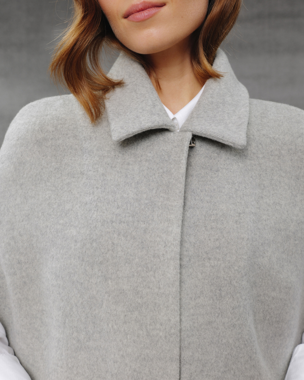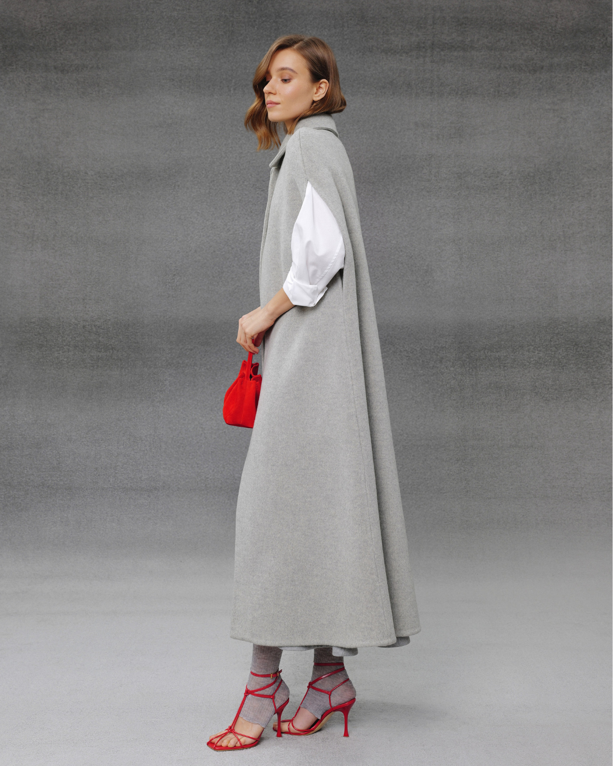Сірий кейп з чистою, лаконічною формою та м’яко вибудуваним силуетом. Працює як елемент верхнього одягу для створення елегантного, стильного образу, поєднуючи функціональність пальта з більшою свободою руху. Легко інтегрується в багатошарові стилізації, додаючи відчуття простору та зібраності.