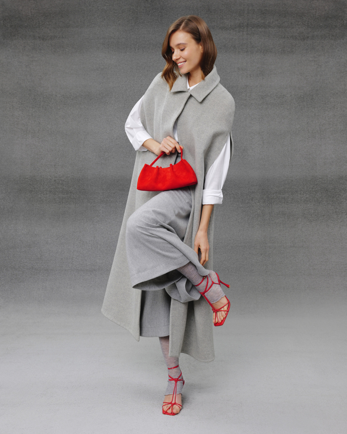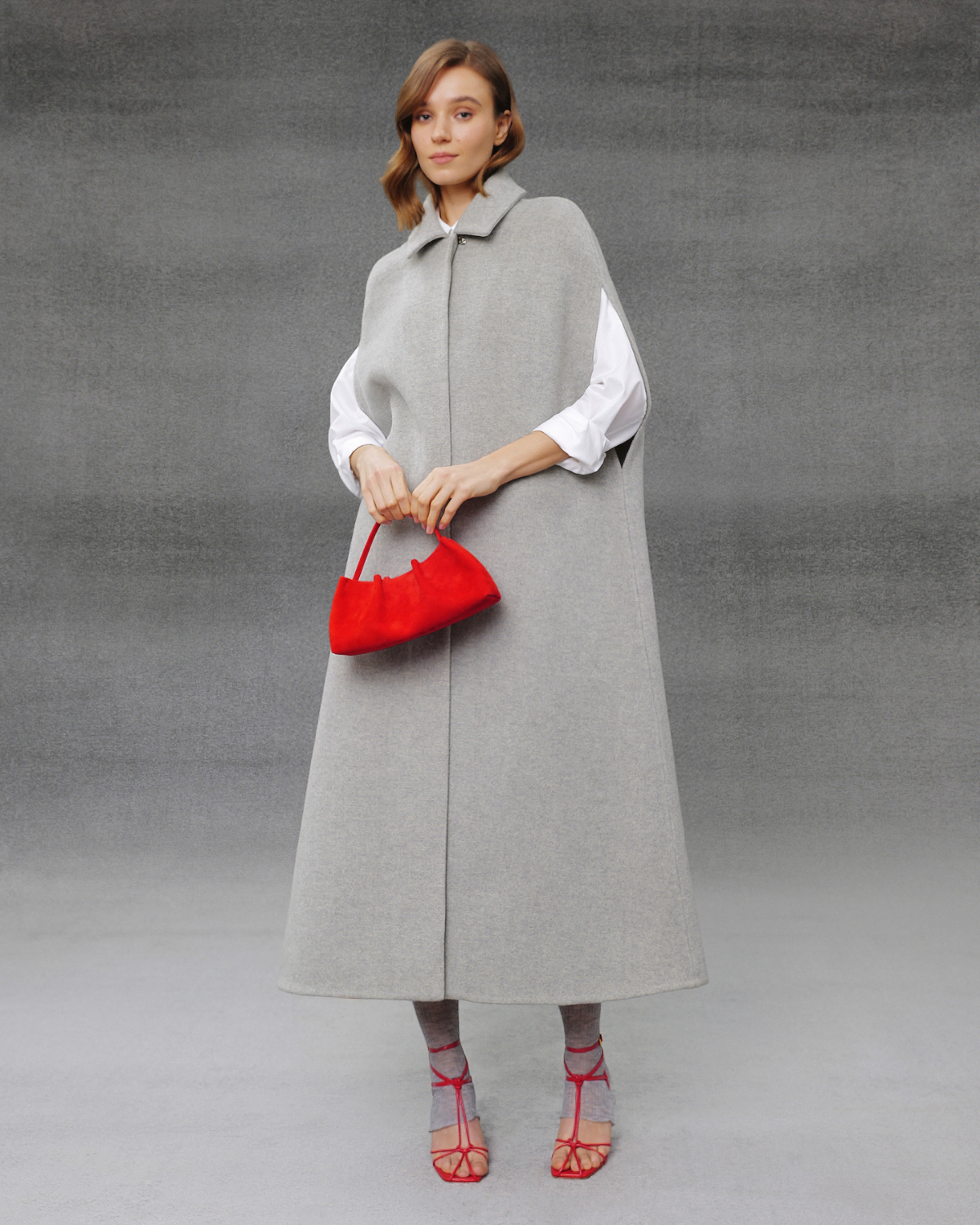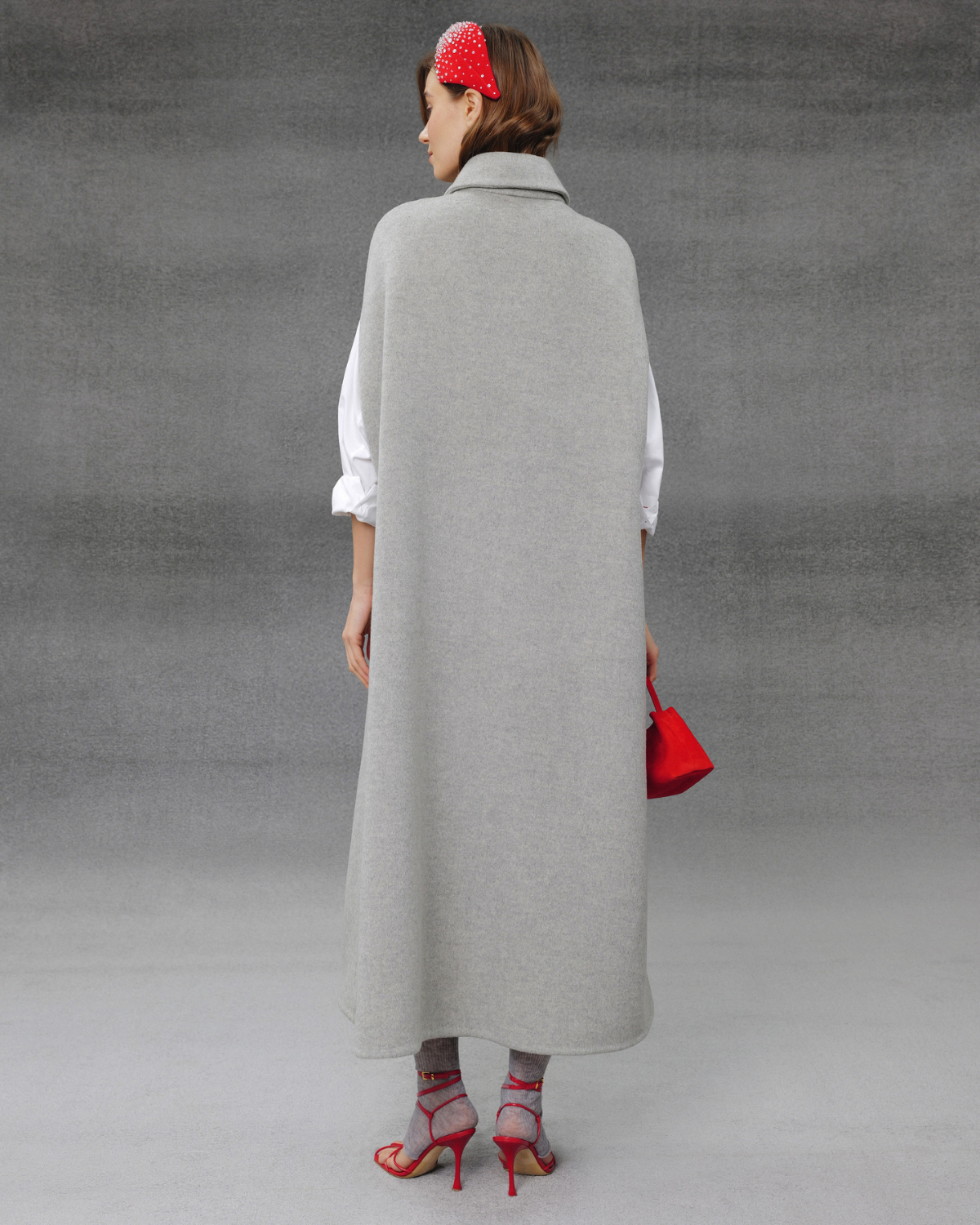 Сірий кейп з чистою, лаконічною формою та м’яко вибудуваним силуетом. Працює як елемент верхнього одягу для створення елегантного, стильного образу, поєднуючи функціональність пальта з більшою свободою руху. Легко інтегрується в багатошарові стилізації, додаючи відчуття простору та зібраності.