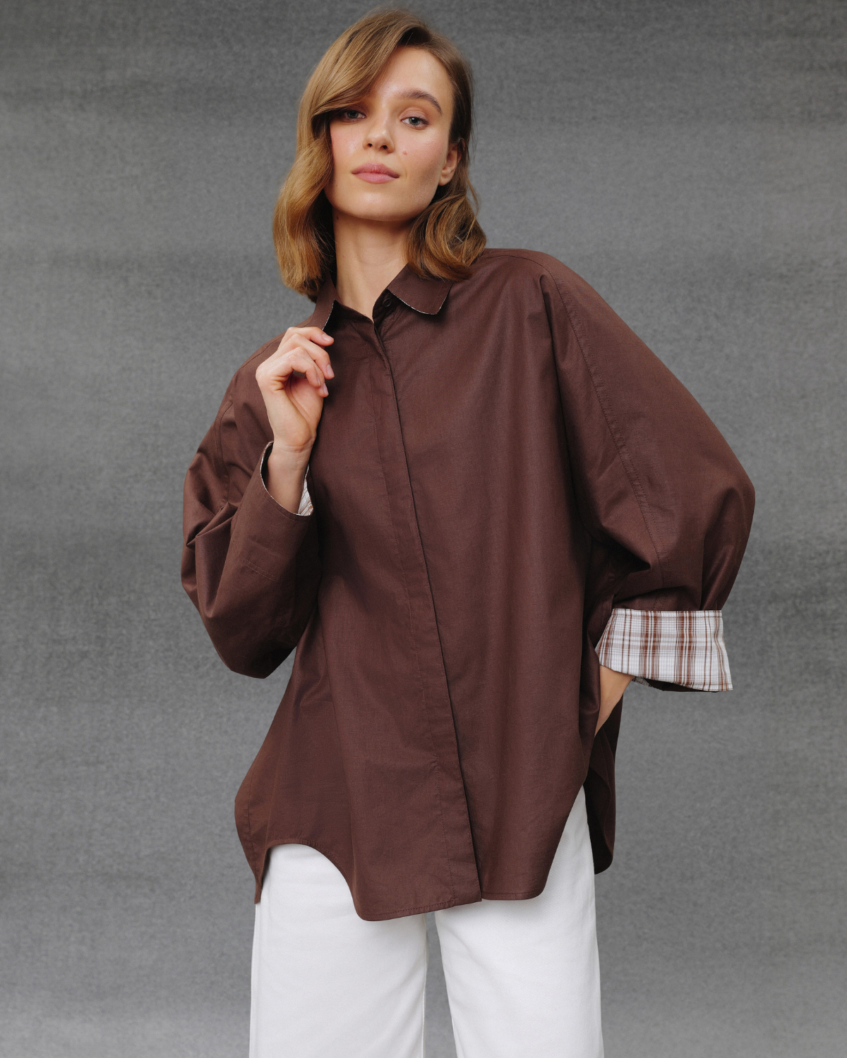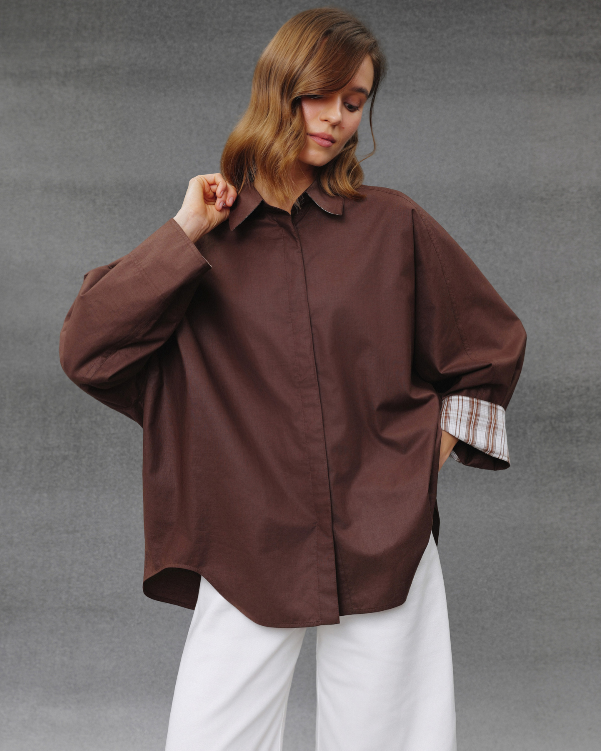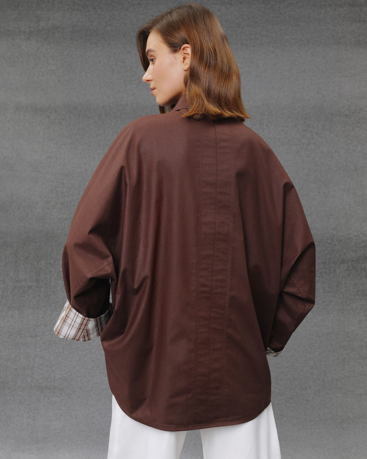 Оверсайз сорочка з чистим силуетом і акцентними об’ємними рукавами. Щільна бавовна, м’який шоколадний відтінок, контрастна внутрішня манжета. Лаконічна база з характером.