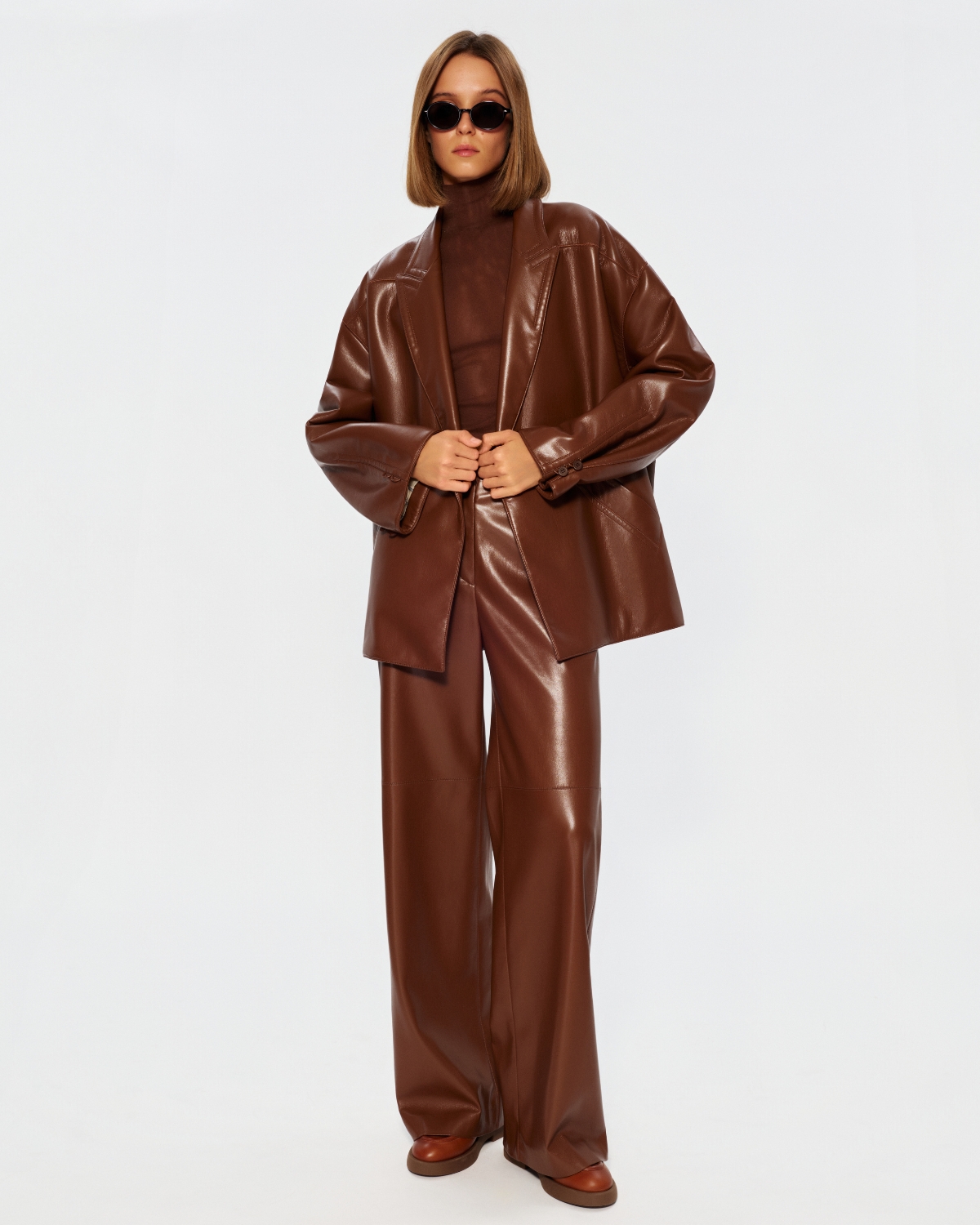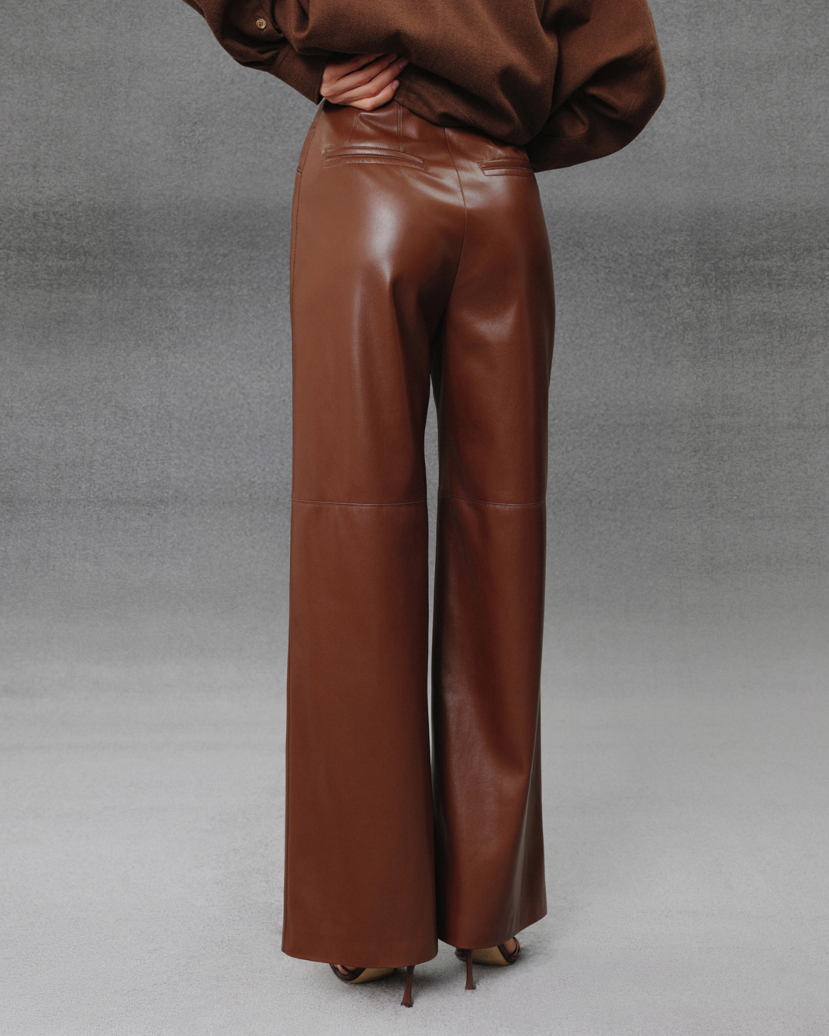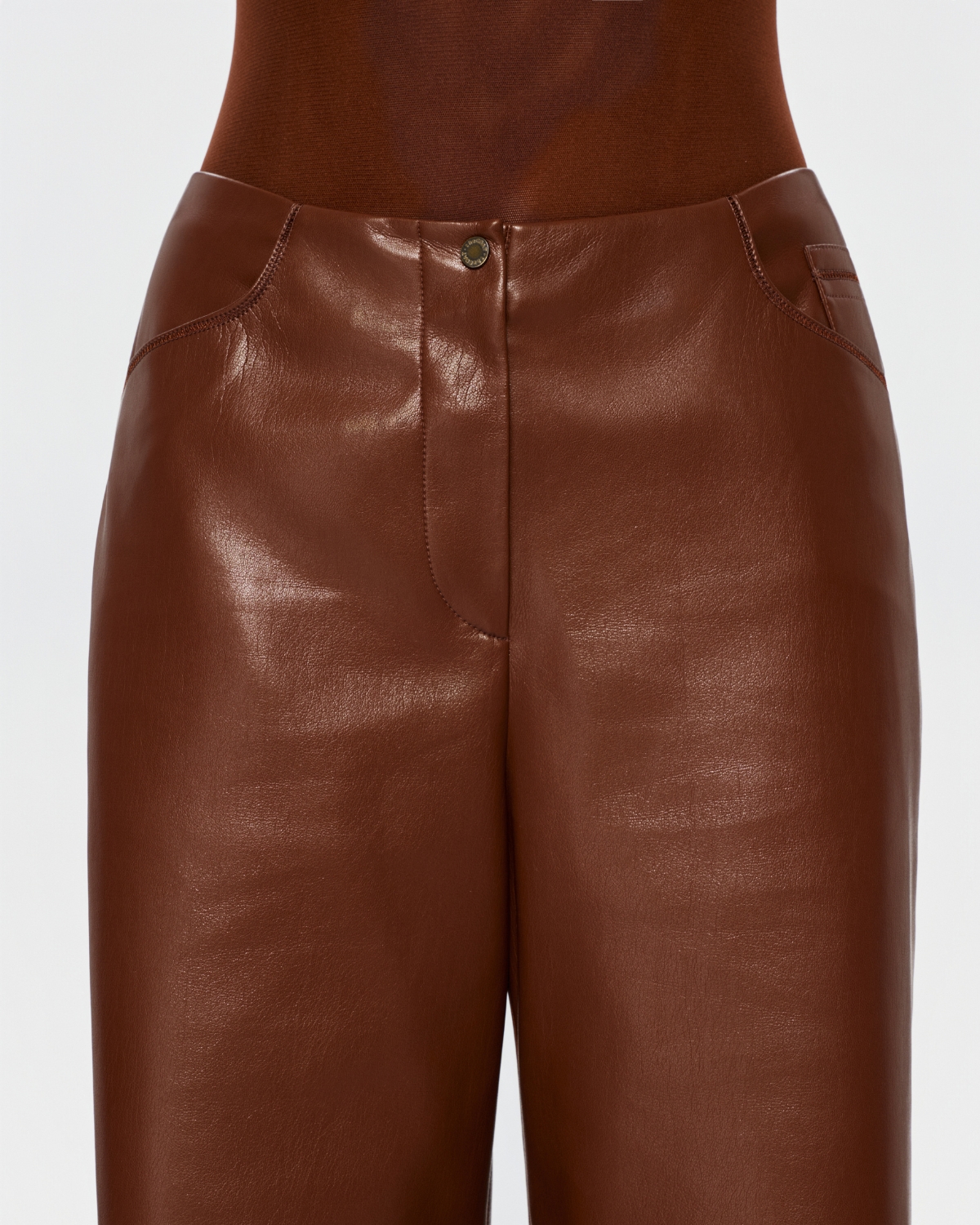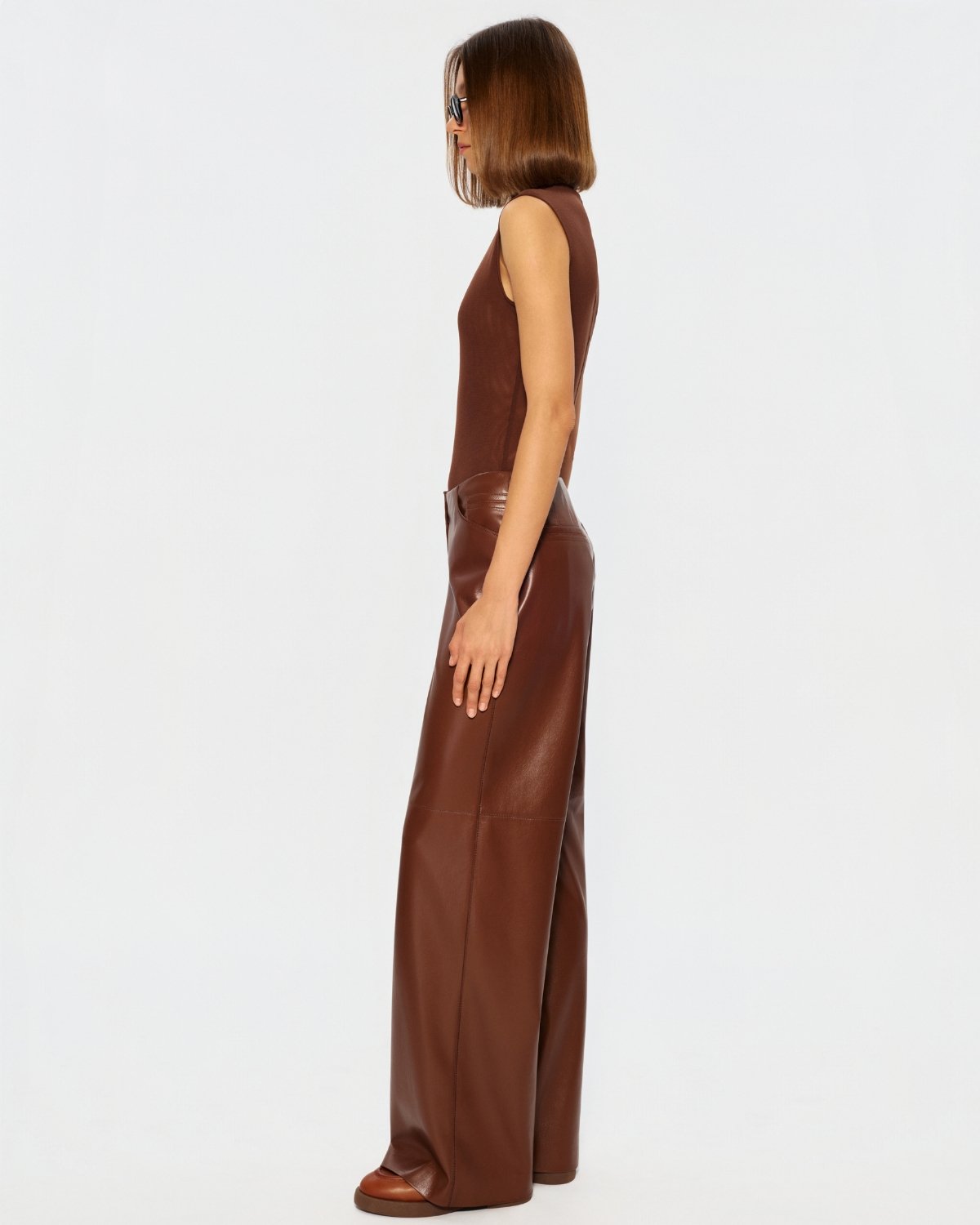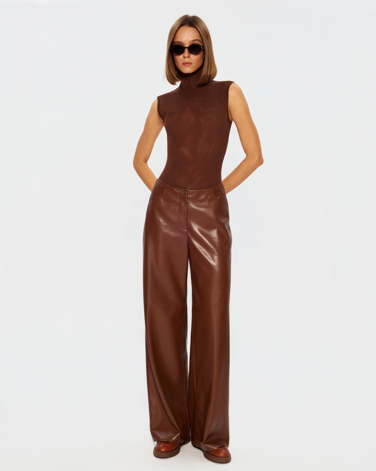 Штани палаццо з екошкіри у відтінку еспресо з чітко вибудуваним, витягнутим силуетом. Гладка поверхня з делікатним блиском підкреслює глибину кольору, а висока посадка акцентує талію. Широкі штанини та декоративні строчки формують сучасну форму — мінімалістичну, вивірену й виразну в деталях.