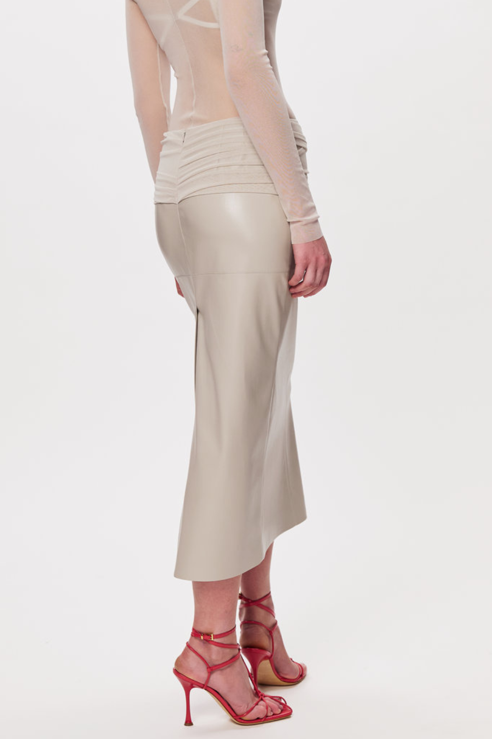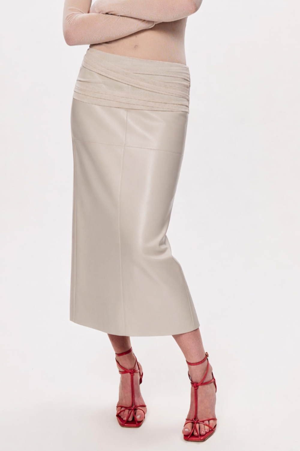 Максі спідниця з м’якої екошкіри з витягнутим силуетом. Драпірування на лінії талії формує м’який акцент і підкреслює фігуру, зберігаючи стриману, чисту геометрію. Мінімалістична річ для сучасних, зібраних образів.
