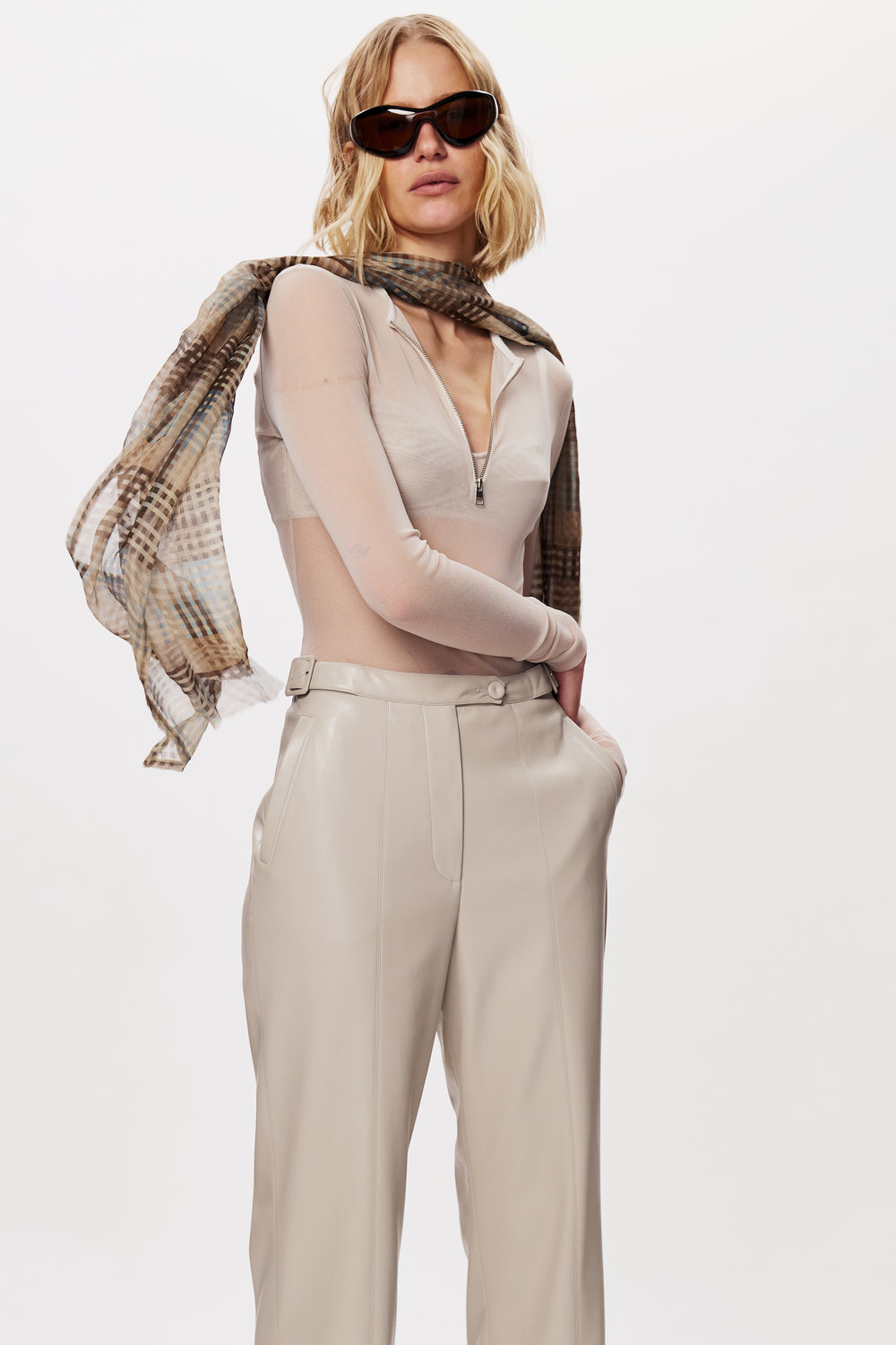 Легка прозорість як частина образу. Боді з тонкої еластичної сітки м’яко повторює лінії тіла, створюючи чистий, графічний силует. Напівпрозора текстура додає глибини багатошаровим поєднанням — під жакет, сукню-комбінацію чи фактурний светр. Глибока блискавка додає графіки та дозволяє регулювати відкритість. Лінії крою підкреслюють форму без зайвого тиску — усе про баланс.