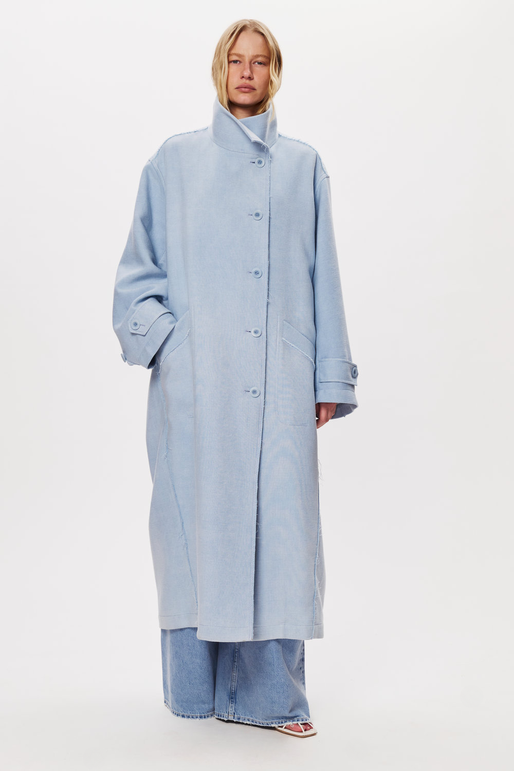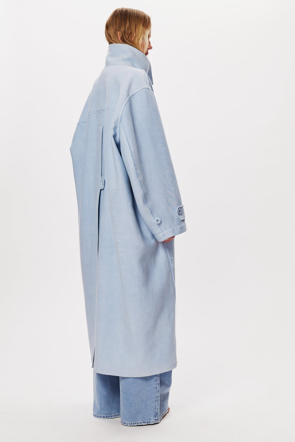 Тренч у трендовому відтінку – інтерпретація класики через призму м’якої архітектури. Силует прямий, подовжений, з делікатно спущеною лінією плеча, що створює відчуття невимушеного об’єму. Високий комір-стійка формує чіткий профіль і додає образу графічності. Рукави широкі, з патами на манжетах – функціональний акцент, який підкреслює характер моделі. На спинці – глибока зустрічна складка з фіксуючим хлястиком, що забезпечує свободу руху та формує виразний вертикальний ритм. Відкриті шви й мінімалістичне оздоблення акцентують на крої та якості тканини. Матеріал щільний, структурний, добре тримає форму, зберігаючи м’якість у русі. Тренч працює як базова верхня річ у міжсезоння, легко інтегрується в багатошарові образи та створює відчуття цілісності.