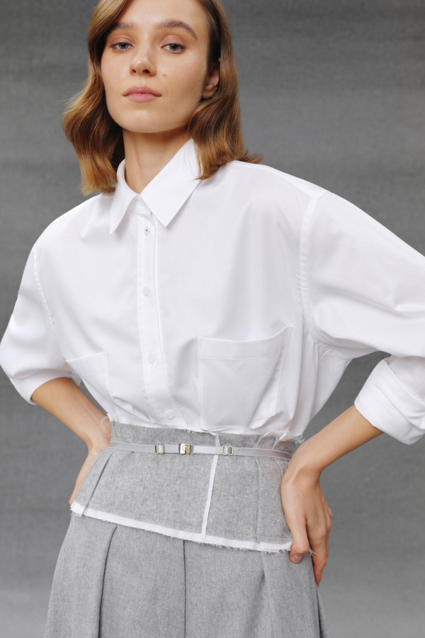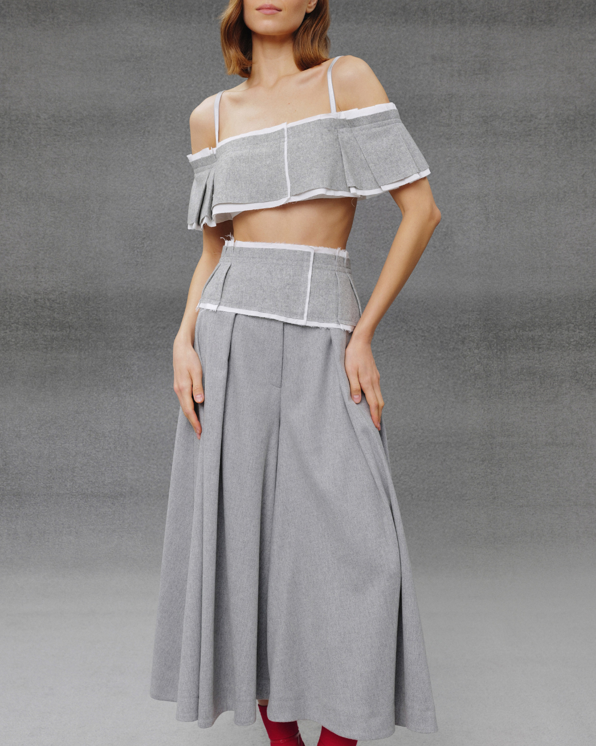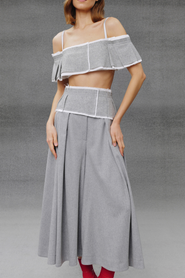 Топ з необробленими краями та відкритими плечима, що поєднує легкість і сучасну елегантність. Модель виконана у світло-сірому відтінку з м’якою текстурою тканини. Широкий волан додає образу повітряності та акцентує лінію плечей, а тонкі бретелі забезпечують комфортну посадку. Укорочена довжина підкреслює талію, роблячи силует витонченим і збалансованим.