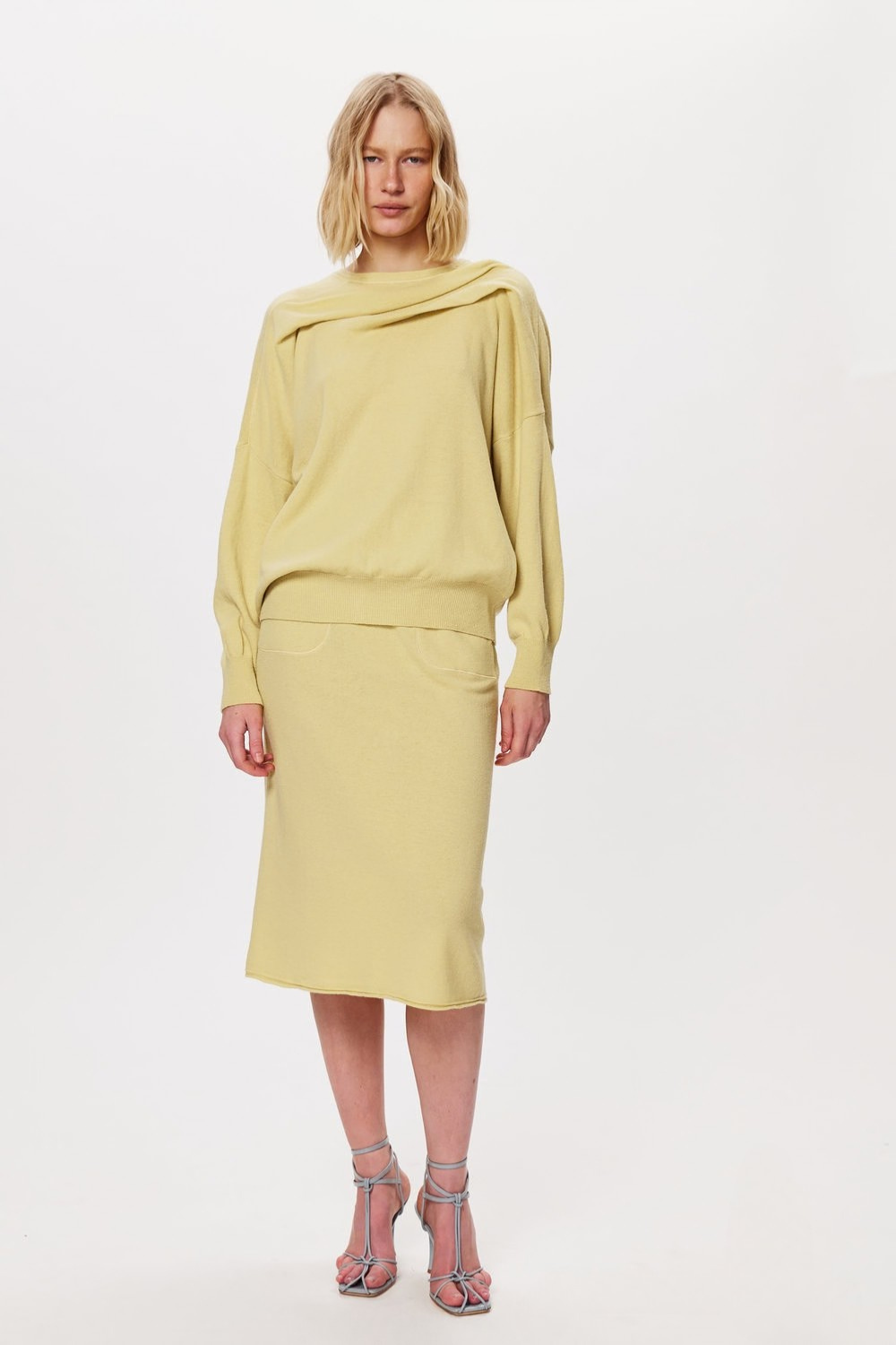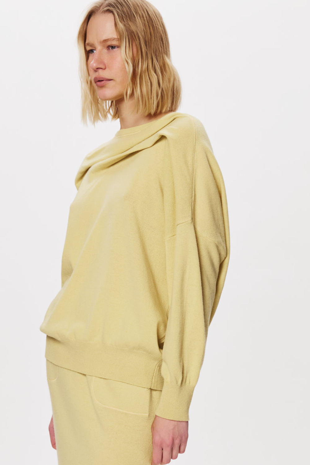 Трикотажний кардиган у відтінку мімози з м’якою драпірованою горловиною. Вільний силует і пластична фактура створюють природний об’єм і комфортну посадку. Лаконічна модель для багатошарових повсякденних образів.